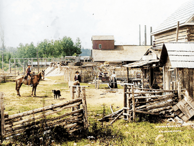 Ernest Patenaude, à g., à Harper’s Camp, aujourd’hui le village de Horsefly, près de la ville actuelle de Williams Lake C.-B., en 1896. (Source – Horsefly Museum)