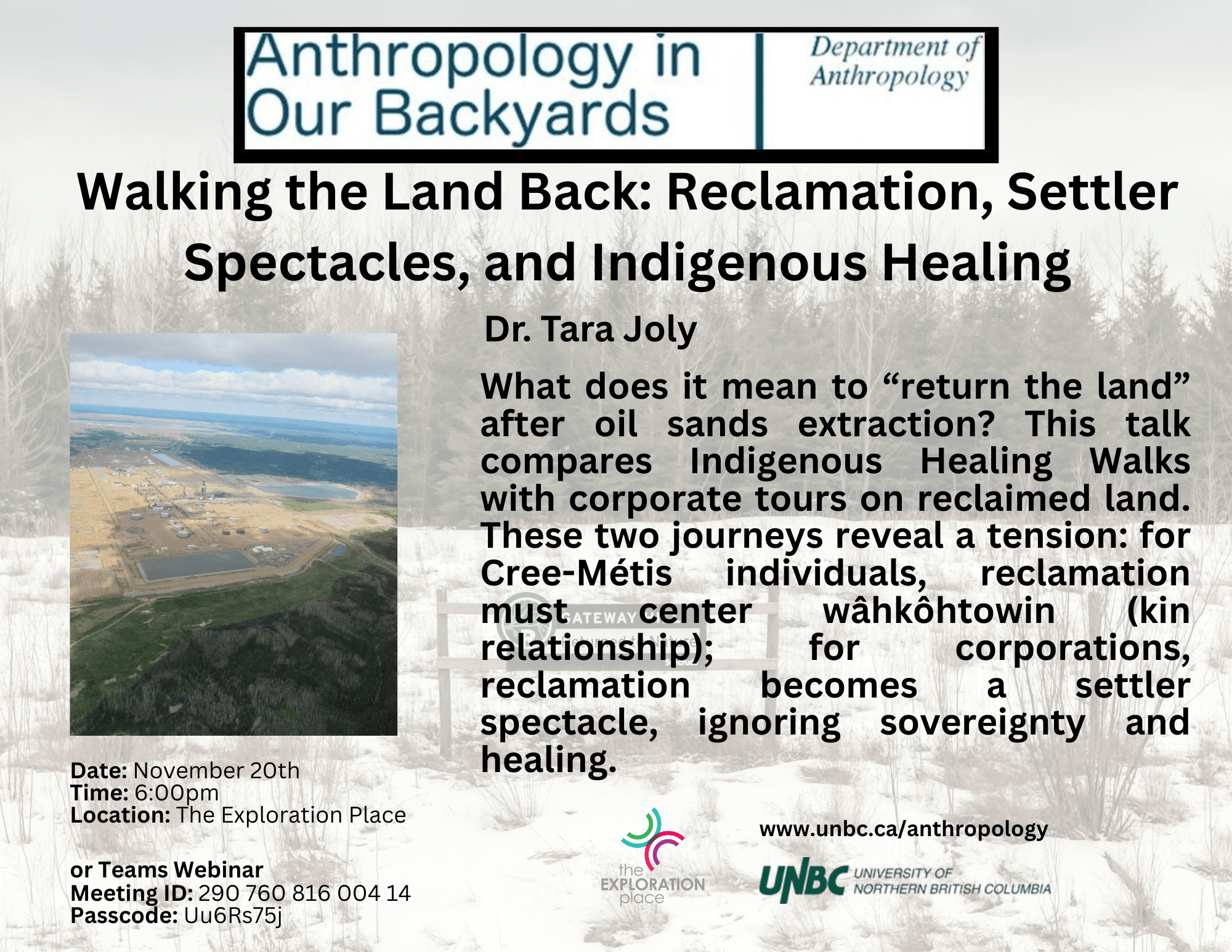 The Exploration Place 333 Becott Place, Prince George, British Columbia, CanadaAnthropology in Our Backyards - Walking the Land Back: Reclamation, Settler Spectacles, and Indigenous Healing Dr. Tara Joly, Assistant Professor, First Nations Studies, Adjunct Professor, Anthropology What does it mean to “return the land” after oil sands extraction? This talk compares Indigenous Healing Walks with corporate tours on reclaimed land. These two journeys reveal a […]